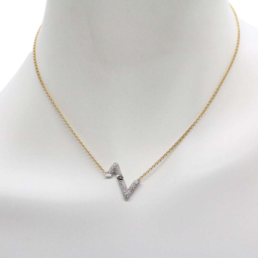 「LV ヴォルト コレクション」の「ペンダント LV ヴォルト アップサイド ダウン」。 「L」と「V」の2文字を組み合わせ、107個の眩いダイヤモンドをパヴェセッティング。 デコルテラインで存在感を放ちます。
