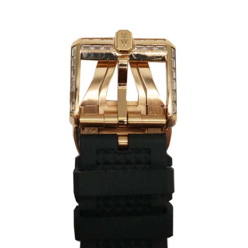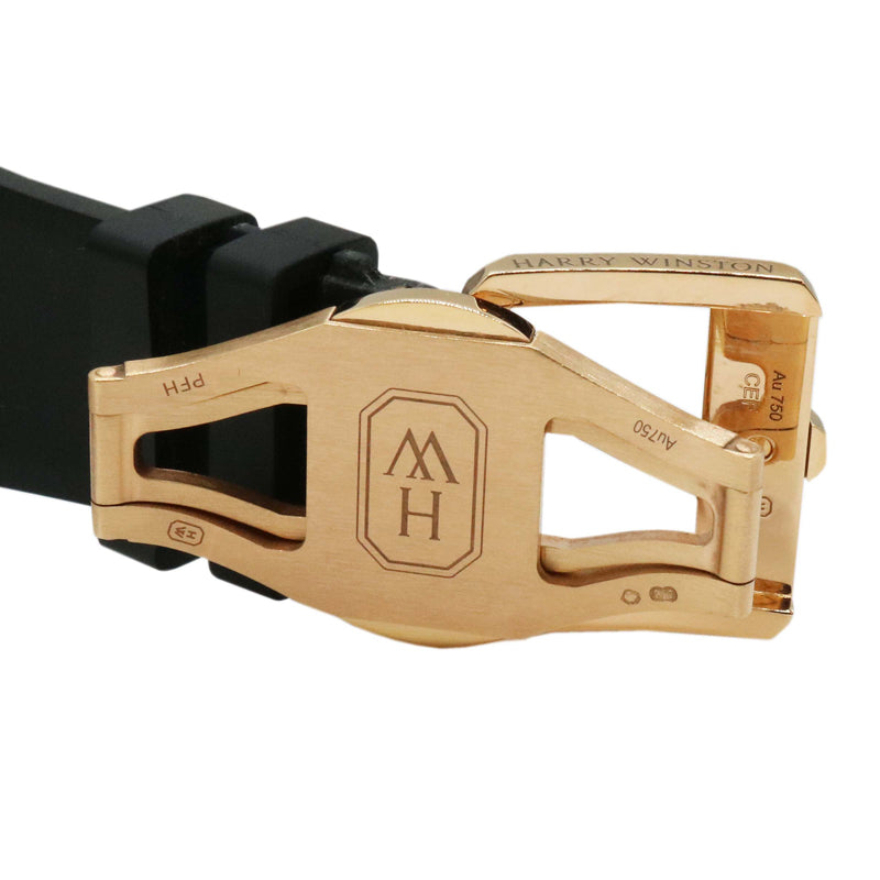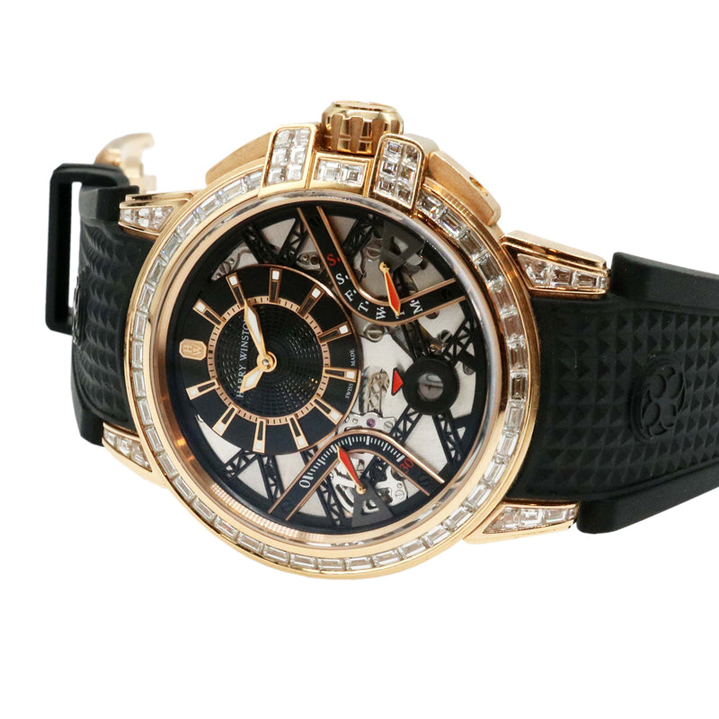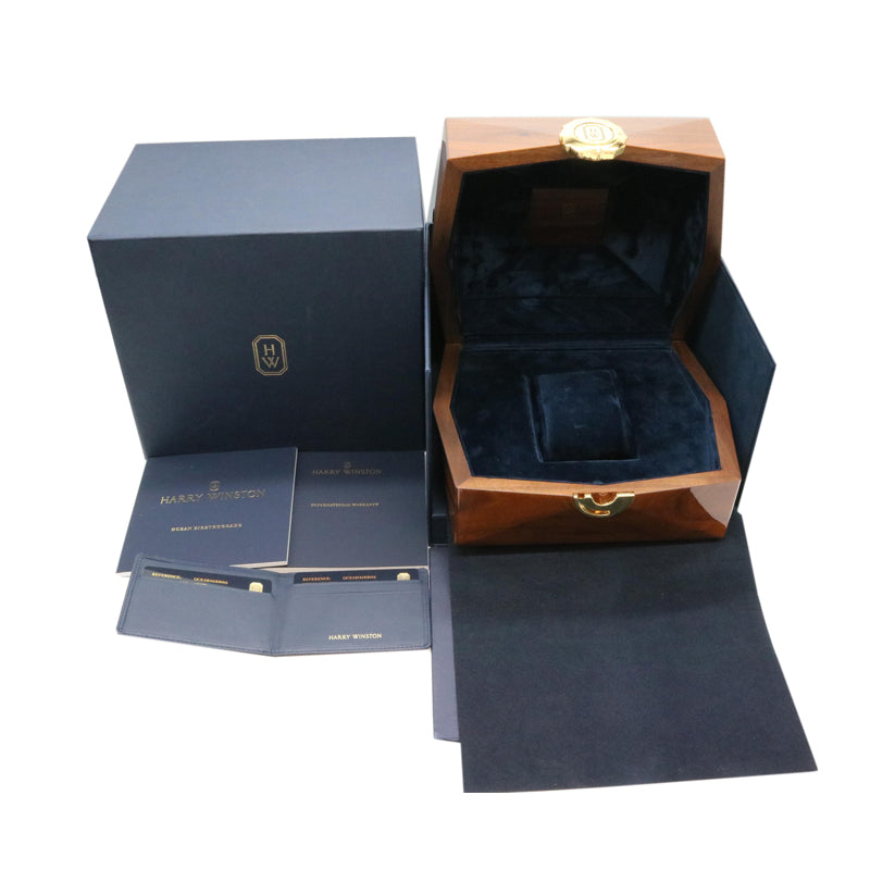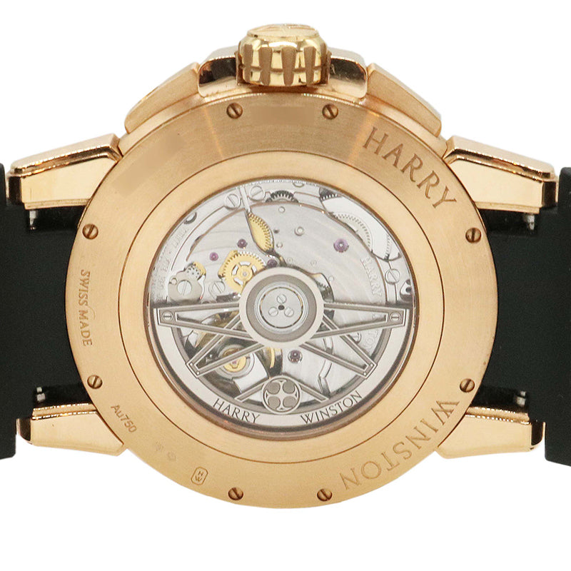 2017年発表のオーシャン バイレトログラードオートマティック。世界20本リミテッドモデルです。直径42mmのローズゴールドケースにはハリーウィンストンならではの厳格な基準で選ばれた約4.41ct(91石)のバゲットダイヤモンドがセッティングされています。
