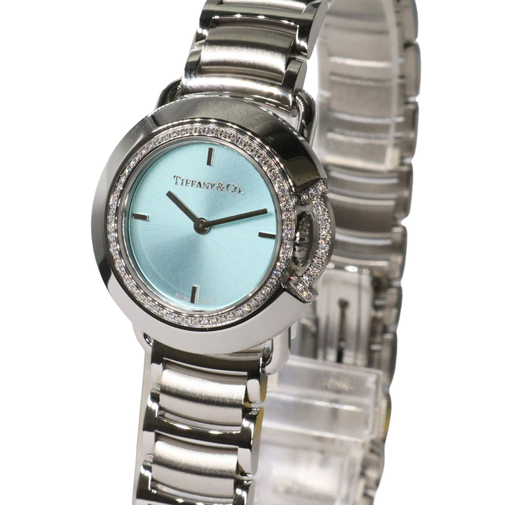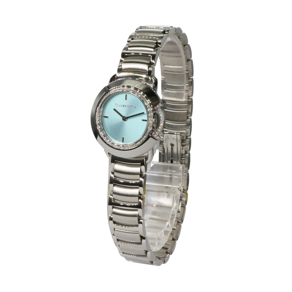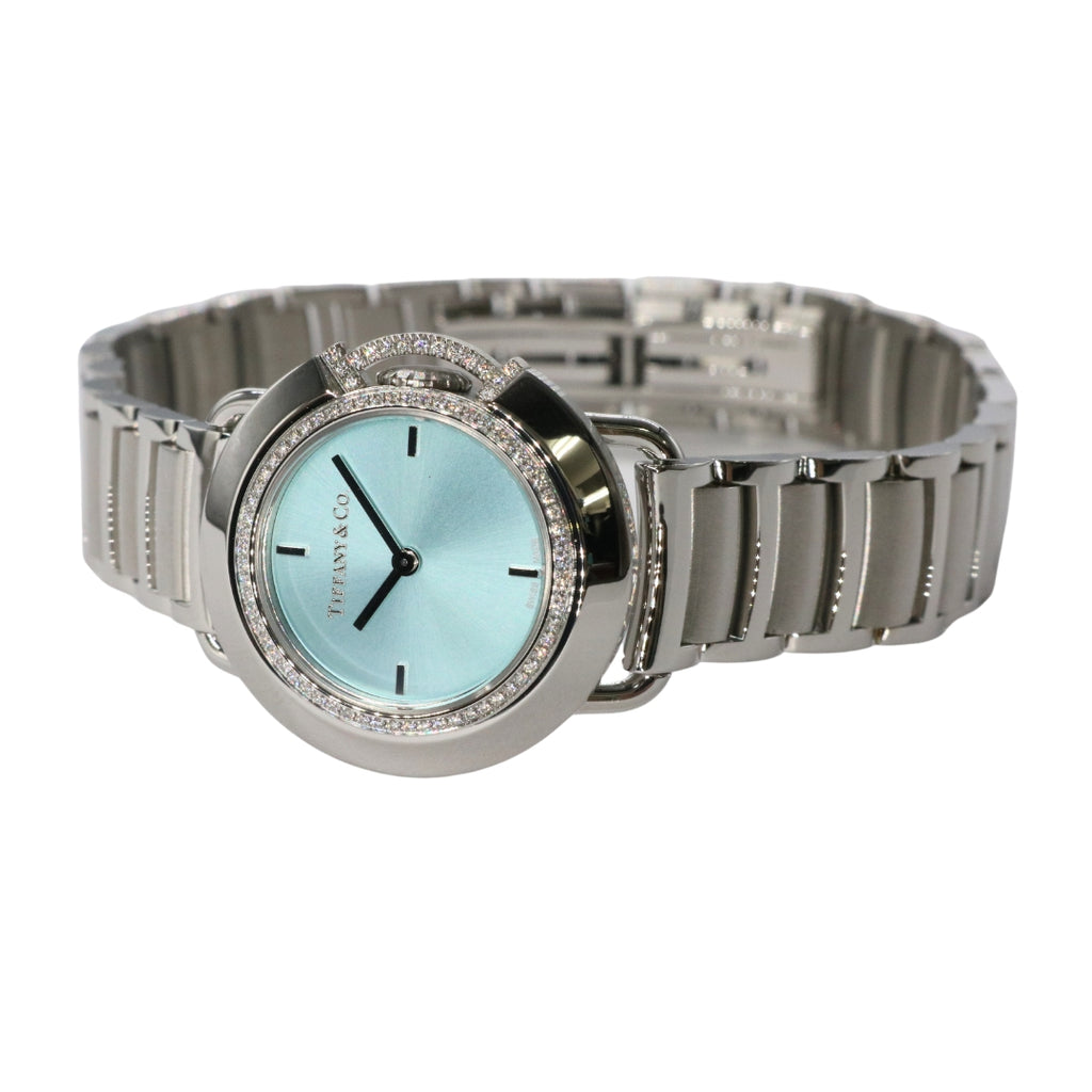 ティファニーのアイコニックな「T スマイル」モチーフが、リューズに美しい線を描いています。ティファニーカラーの文字盤と、ベゼルやリューズカードにダイヤモンドをセッティングした華やかなモデルです。