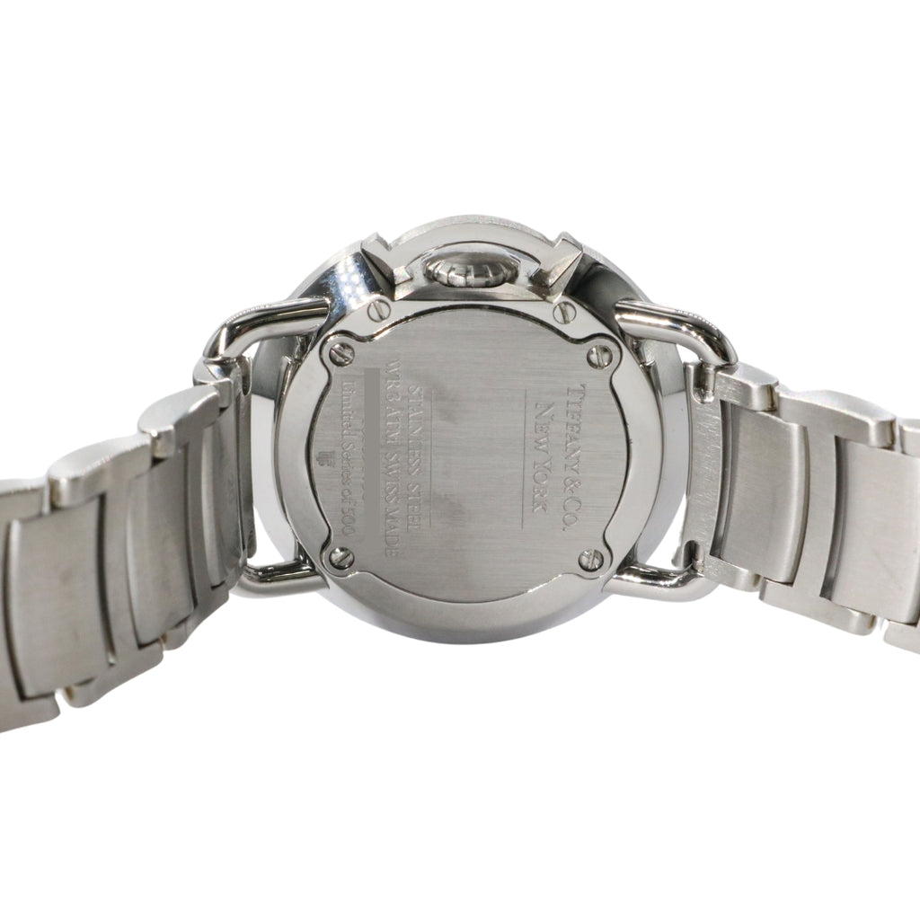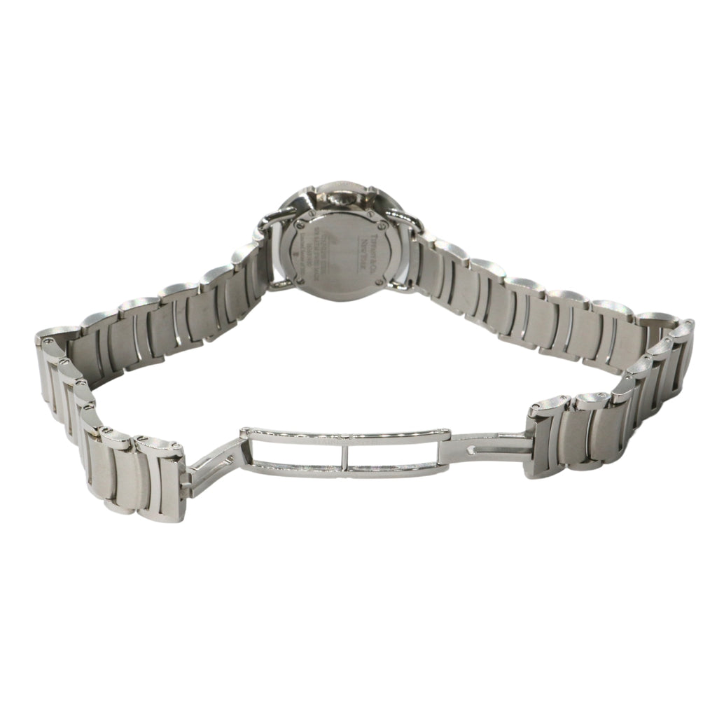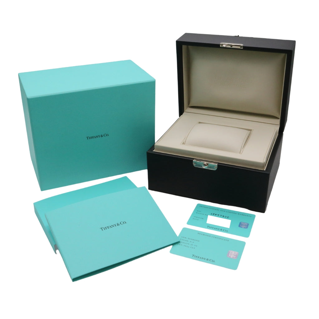 ティファニーのアイコニックな「T スマイル」モチーフが、リューズに美しい線を描いています。ティファニーカラーの文字盤と、ベゼルやリューズカードにダイヤモンドをセッティングした華やかなモデルです。